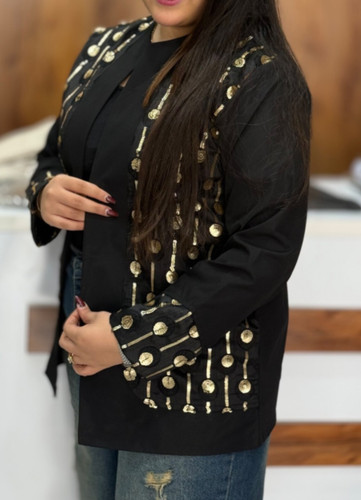 کت زنانه مدل شیما– کت لینن کجراه بهاره پولکدار در رنگ زیبای طوسی مشکی | سایز ۱ و ۲