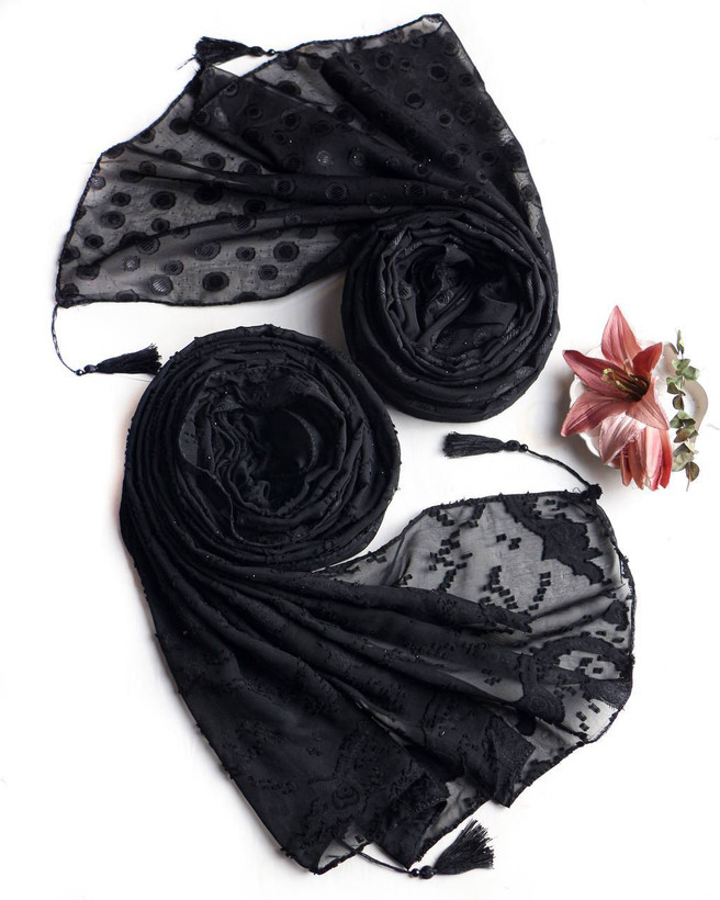 شال تک رنگ مشکی حریر، طرحدار نگین دار