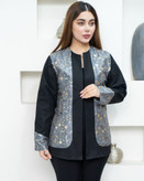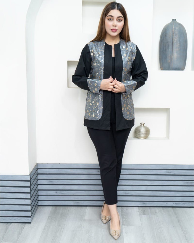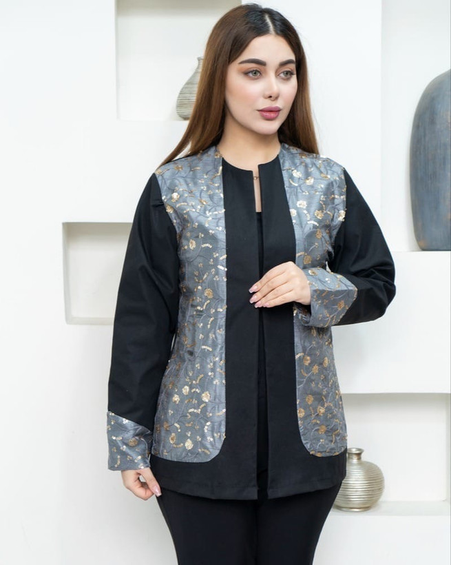 کت زنانه مدل شیما– کت لینن کجراه بهاره پولکدار در رنگ زیبای طوسی مشکی | سایز ۱ و ۲