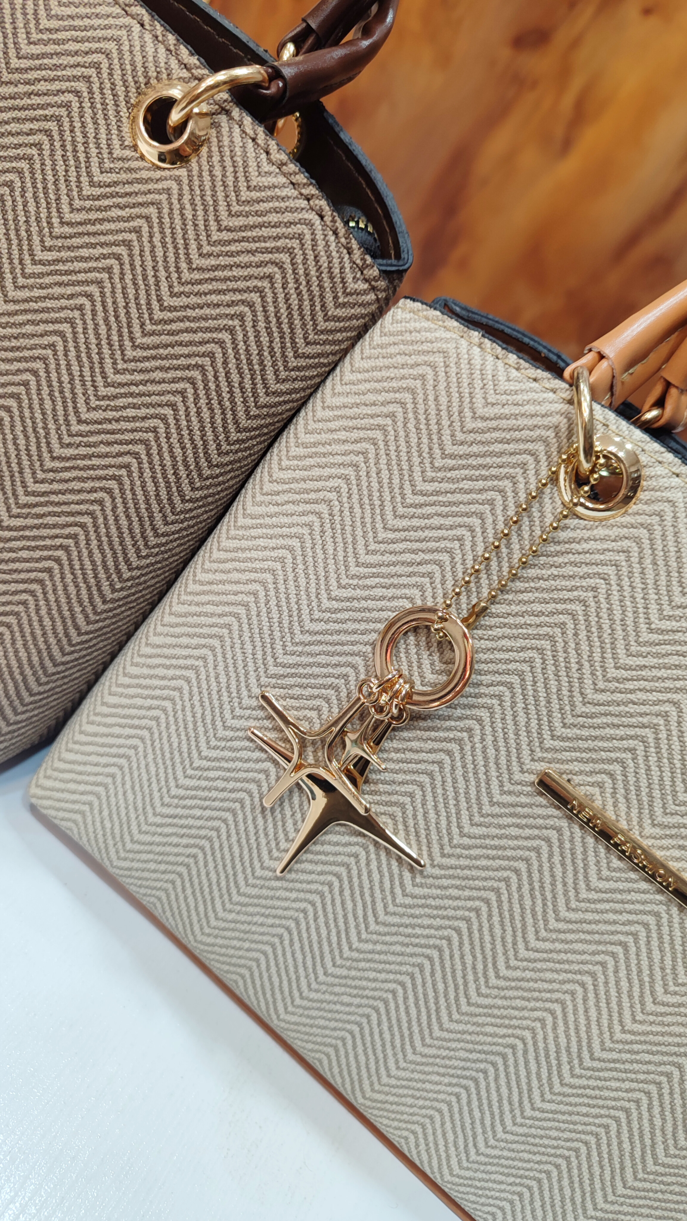 طراحی منحصربهفرد: بافت حصیری زیگزاگی، در کنار یراقآلات طلایی درخشان و آویز ستارهای ظریف، جلوهای لوکس و چشمگیر به این کیف بخشیده است که نگاهها را به خود خیره میکند.
