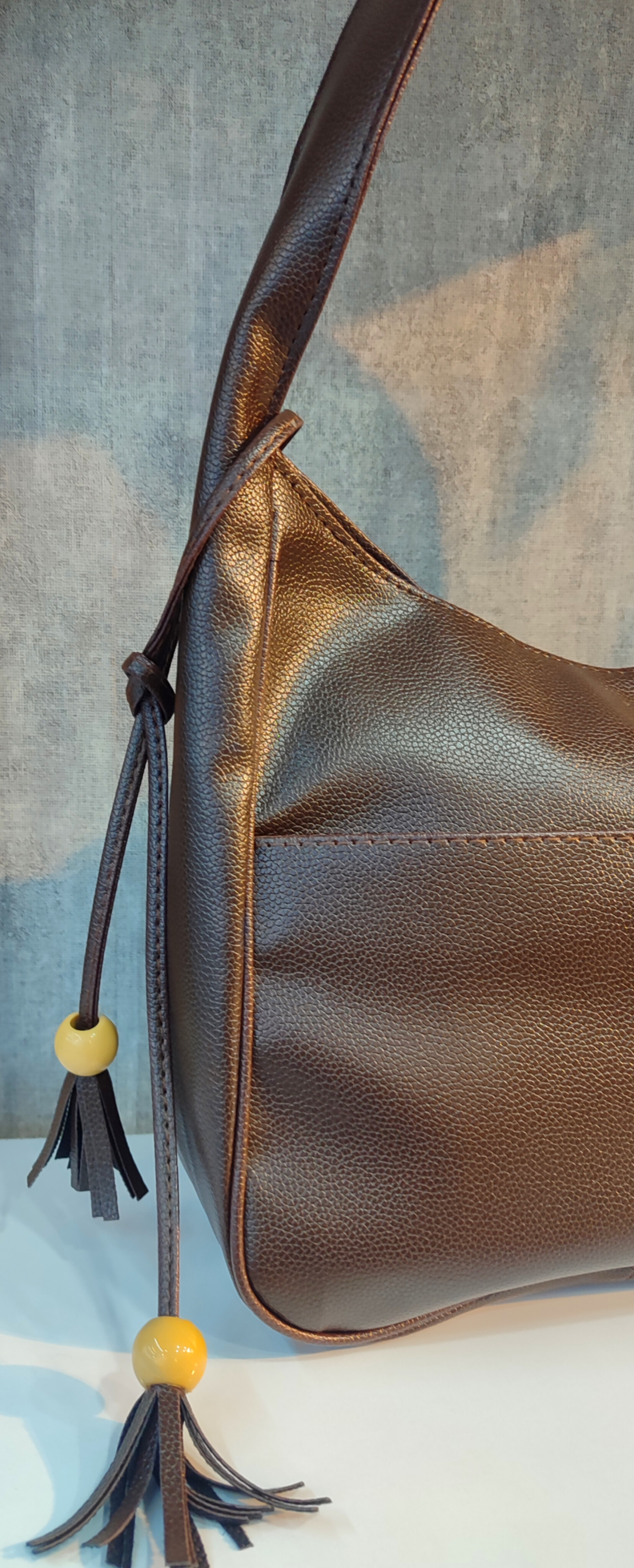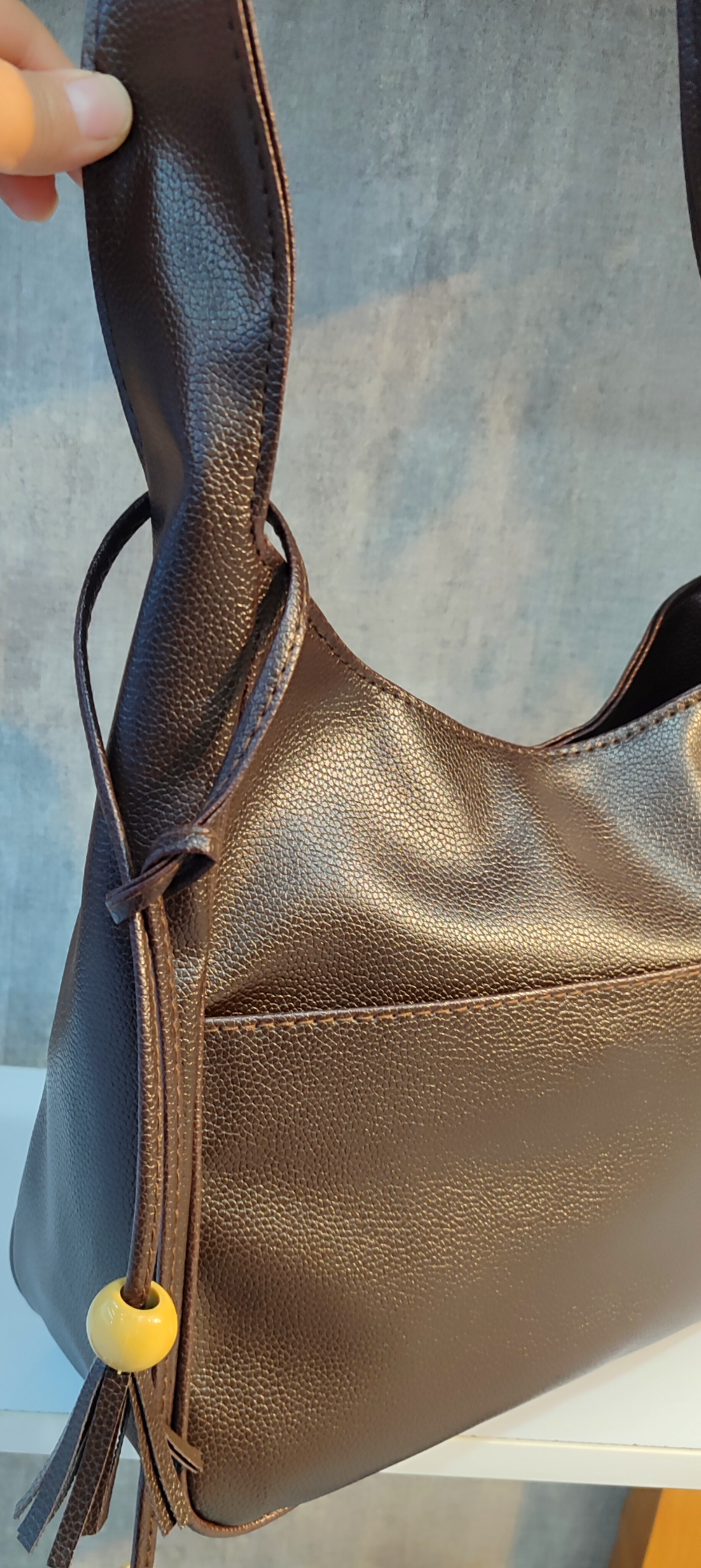در قسمت کناری، یک آویز فانتزی با منگولههای چوبی قرار گرفته که جلوه کیف را خاصتر و جذابتر میکند.